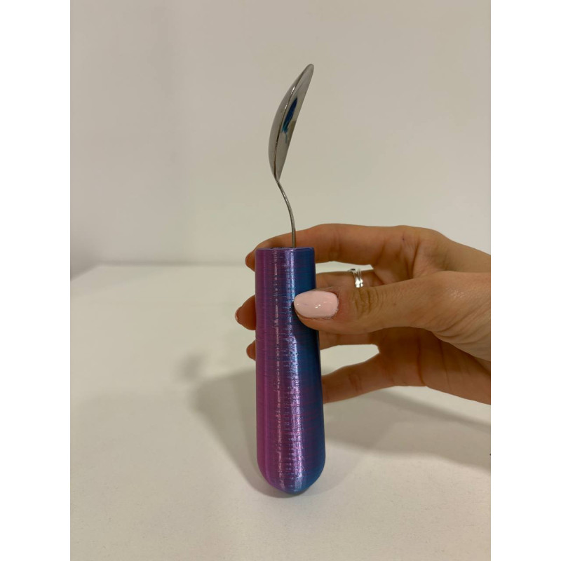 Producto de apoyo, creado desde el área de terapia ocupacional con impresión 3D y filamento adaptado para uso alimentario. El mango aumenta el grosor del agarre del cubierto para facilitar su manipulación.